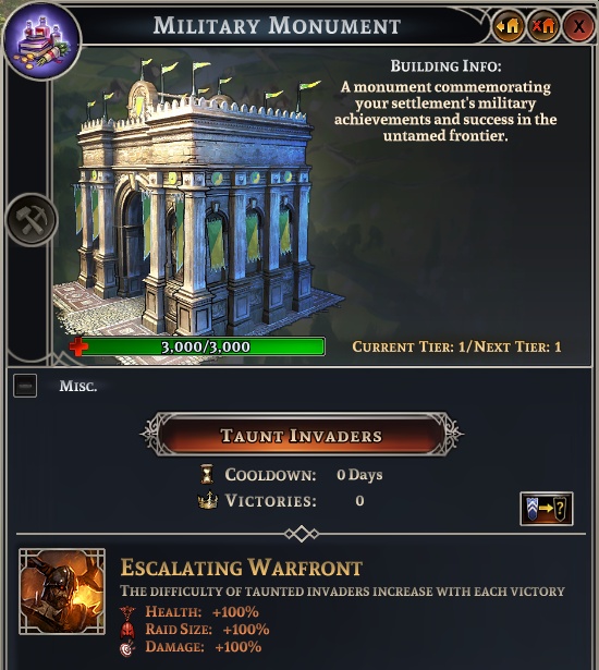 Tot slot zal het Militaire Monument een symbool zijn van de veerkracht van je nederzetting. Wat is een betere manier om indringers te laten zien dat je hun aanwezigheid niet zult dulden dan ze te beschimpen? Met dit monument krijg je de kans om je onberispelijke verdediging uit te dagen met eindeloos uitgebreide aanvallen. Hoe ver kom je voordat je nederzetting wordt overspoeld en er een bloedbad ontstaat? Met een aantal creatieve oplossingen die we op internet hebben gezien, denken we dat sommigen van jullie het ver zullen schoppen!