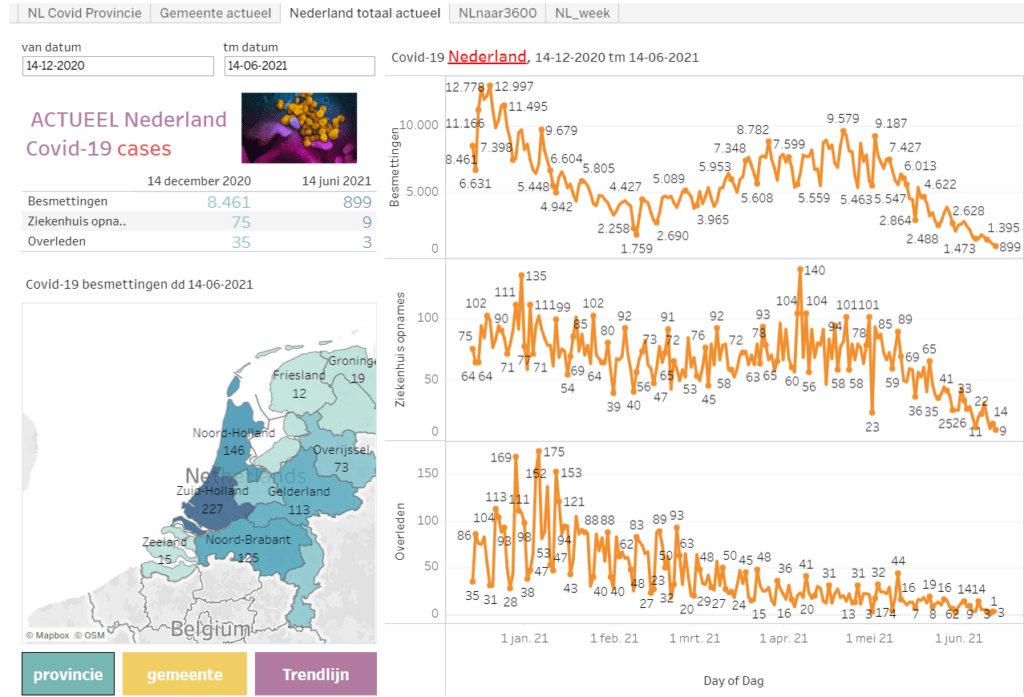 Het Covid Dashboard toont dat op maandag 14 juni het aantal dagelijkse besmettingen onder de 1000 duikt, en ook zijn er minder dan 10 nieuwe ziekenhuisopnames.