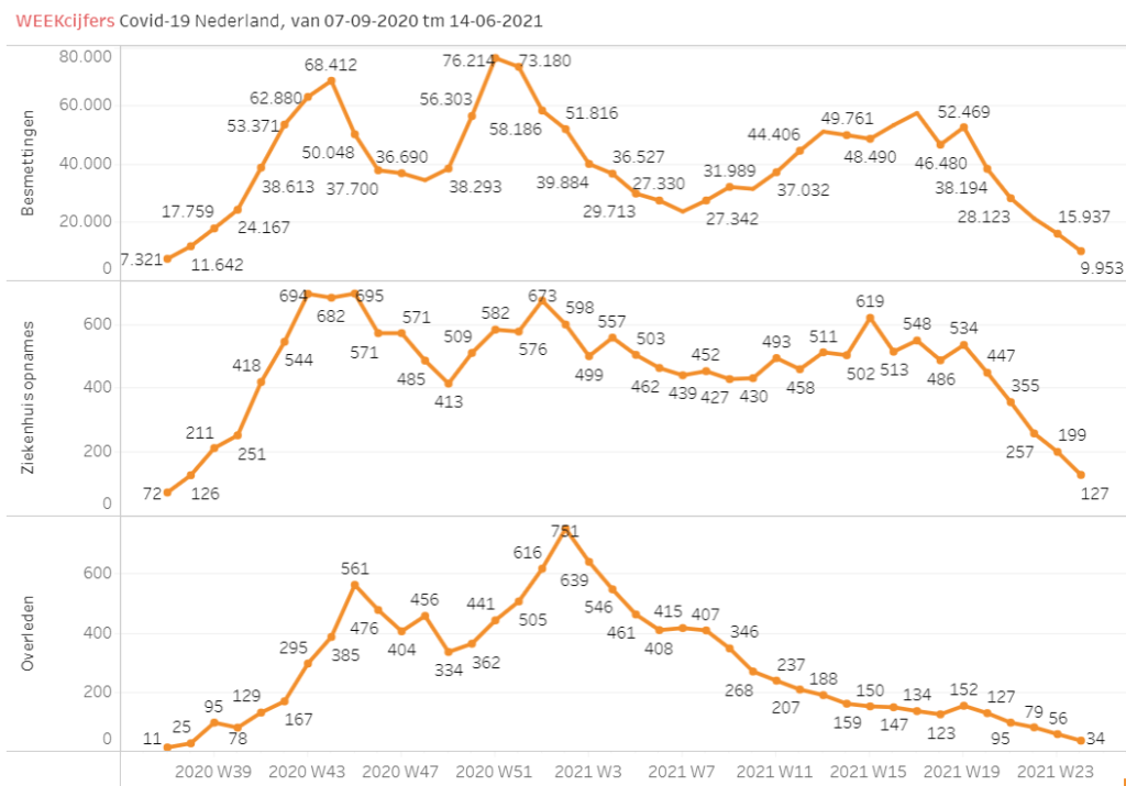 De daling in besmettingen zette afgelopen week flink door. De weekcijfers geven nu aanleiding tot de discussie over snellere versoepelingen en het eventueel loslaten van mondkapjes-verplichtingen her en der.