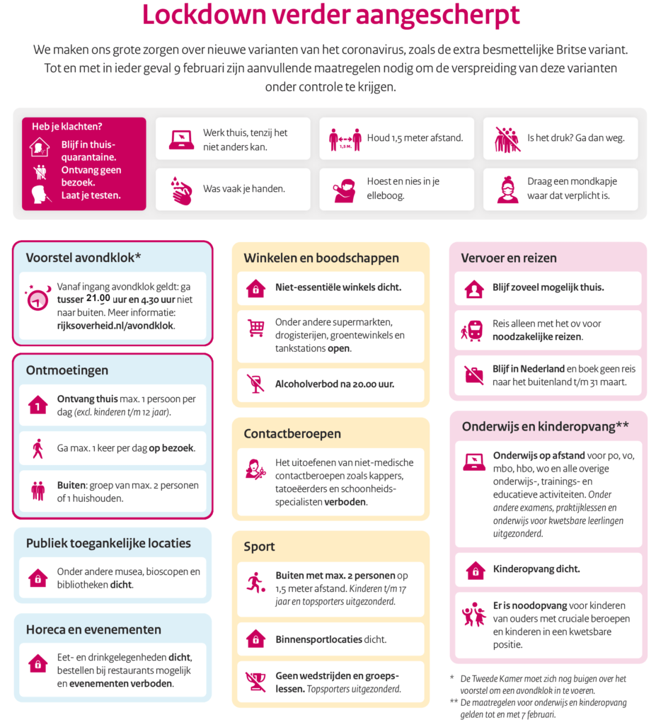 Het kabinet maakt zich grote zorgen om Britse variant van het coronavirus, die nog besmettelijker is dan het virus dat we al kennen. Er zijn extra maatregelen nodig om de nieuwe varianten van het virus onder controle te krijgen. Eén van de maatregelen is het instellen van een avondklok.