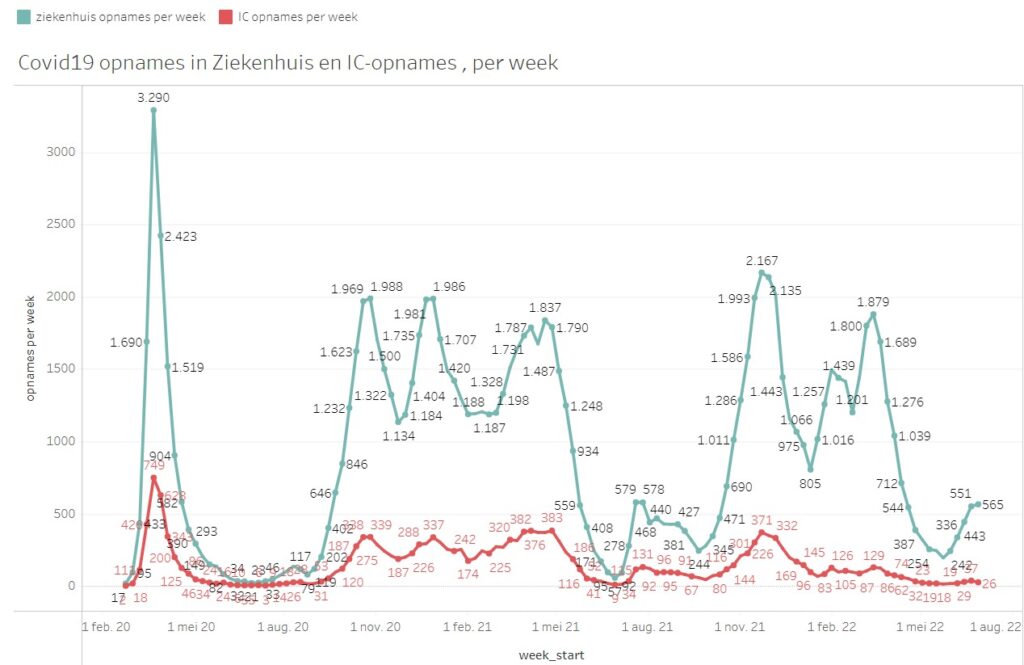 Ook het aantal ziekenhuisopnames met covid-19 is afgelopen weken gestegen.