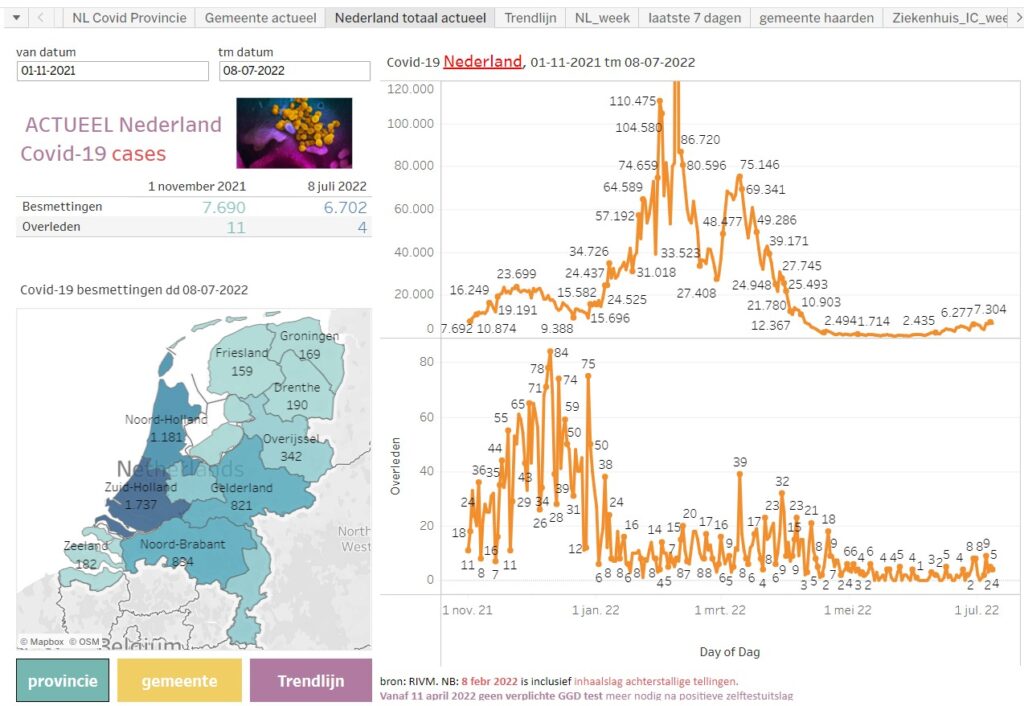 Er zijn aanwijzingen voor een nieuwe golf corona-besmettingen. De teller kwam boven de 7000 per dag op 7 juli 2022. Dit is alleen nog wat door GGD is gemeten. De positieve zelftests zijn buiten beeld. Het daadwerkelijke aantal positieve gevallen licht hoger.