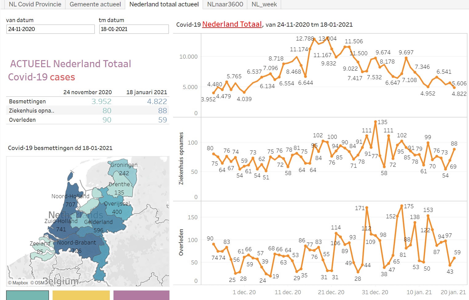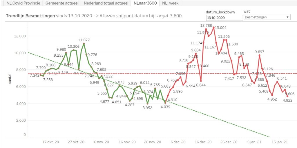 En wat hebben we bereikt met de lockdown t/m 18 januari: aantal besmettingen ging omhoog tot aan kerst en daarna met tegensputteren omlaag. Dagstand: 4822 besmettingen op 18 januari.