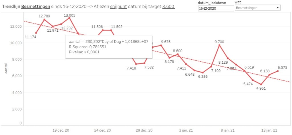 Vanuit een niveau van 6500 op dit moment duurt het dan ruim 12 dagen tot het breakpunt van 3600 besmettingen voor een eventuele versoepeling in zich komt.