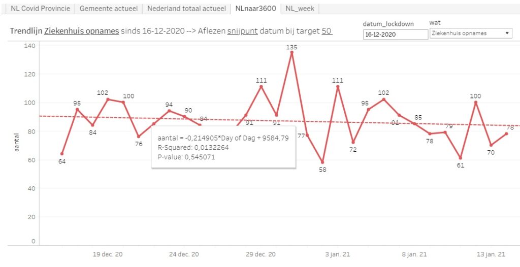 Vanuit 78 ziekenhuisopnames nu duurt in dit tempo het (78-50)/0,22 = 122 dagen (3 maanden !) voordat de 50 per dag wordt bereikt.