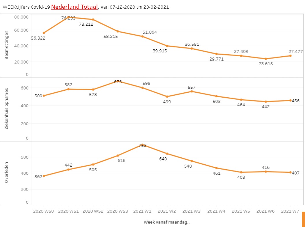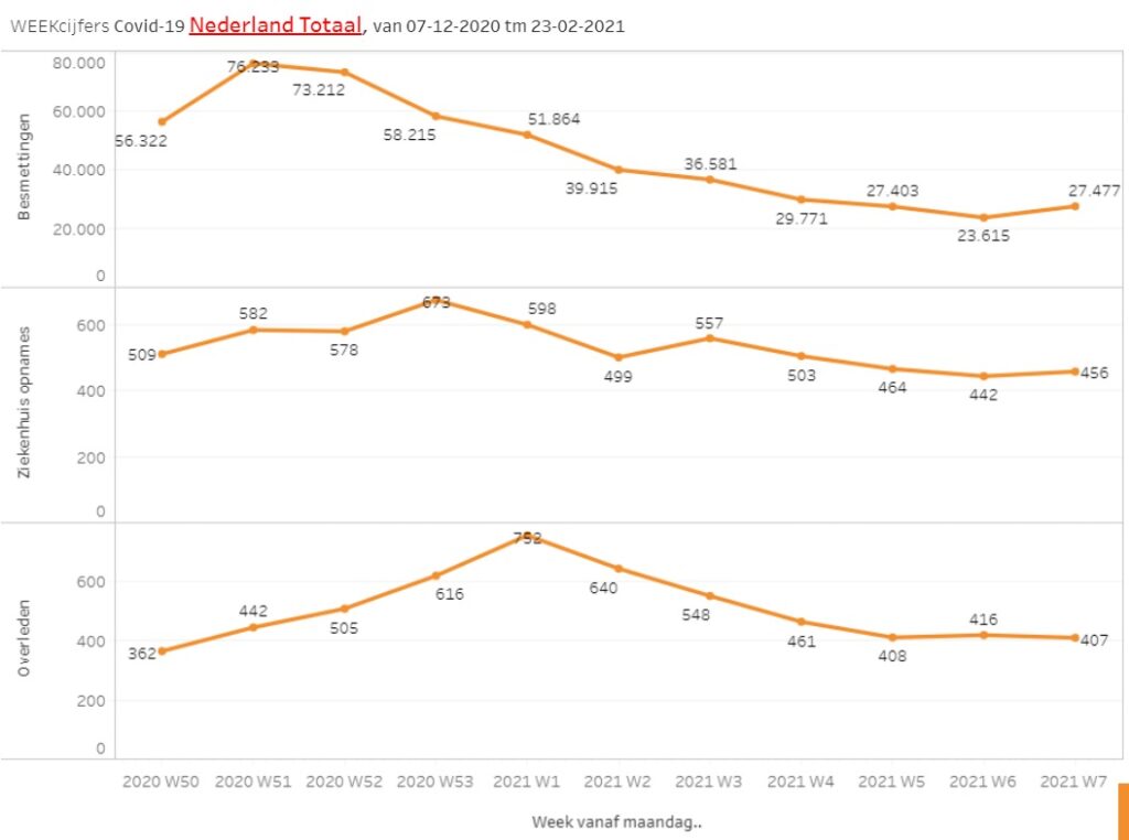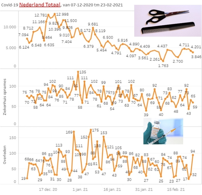 De grens van 3600 besmettingen is al een week niet doorbroken. De regering zit met de “handen in het haar”. De hoop ligt op de opgeschroefde vaccinatiegraad. De aantallen vaccinaties door GGD ligt el een tijdje boven de 25.000 per dag (met 2 dips bij sneeuw en gladheid). Maar daar moet geen rem op komen door niet nagekomen fabrikant-leveringen.