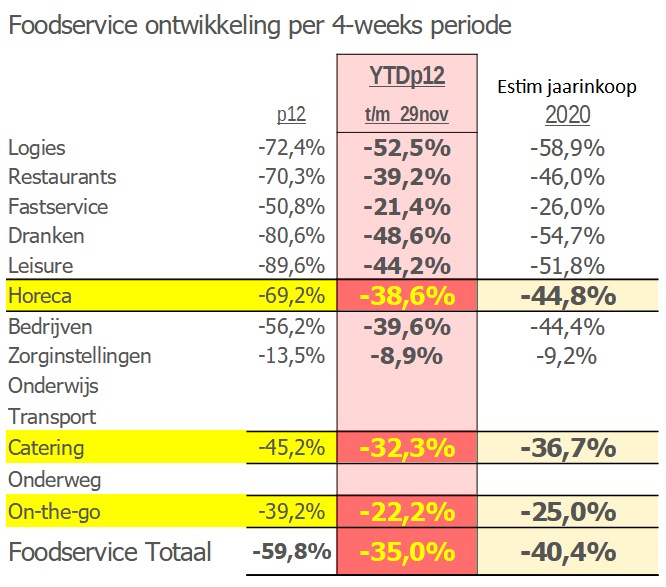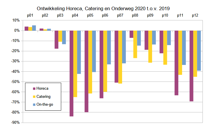 De impact van de verscherpte maatregelen van 15 oktober 2020 zijn in periode 12 duidelijk zichtbaar. Horeca-zaken zijn dicht, alleen afhaal en bezorgen is nog mogelijk. Ook de cateringdiensten in bedrijven en onderwijs liggen grotendeels stil.