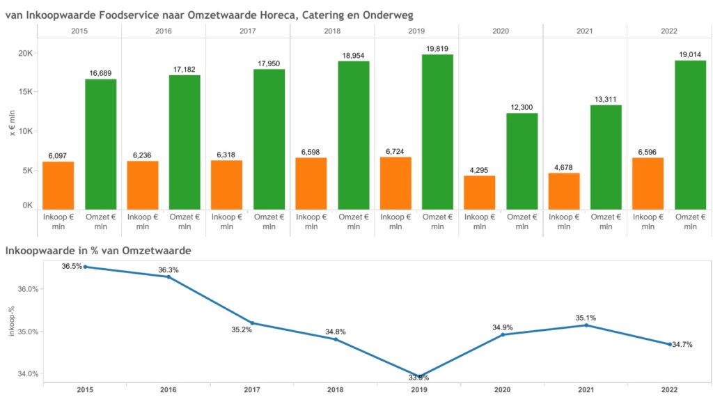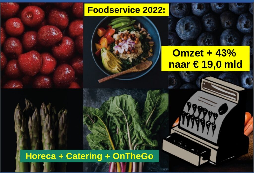 De totale omzet in Foodservice (Horeca, Leisure, Catering en OnTheGo) is uitgekomen op 19,0 miljard euro voor 2022. Dat is een stijging van 43% ten opzichte van 2021.