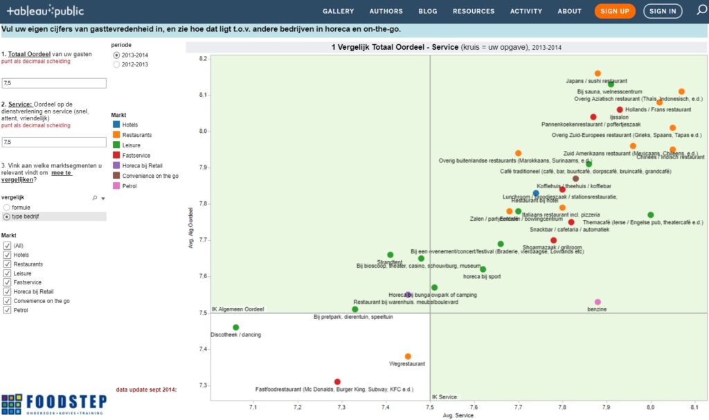 De tableau-tool geeft een instrument voor ‘benchmarken’. U kunt uw eigen cijfers over gastvrijheid vergelijken met landelijke gemiddeldes in horeca en gemak.