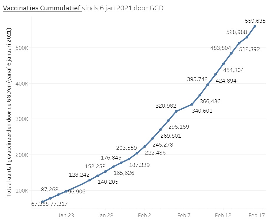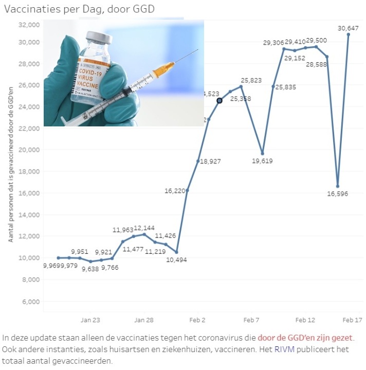 De dagelijkse aantallen Vaccinaties door de GGD is na een paar dips (door sneeuw en gladheid) weer structureel rond 29000.