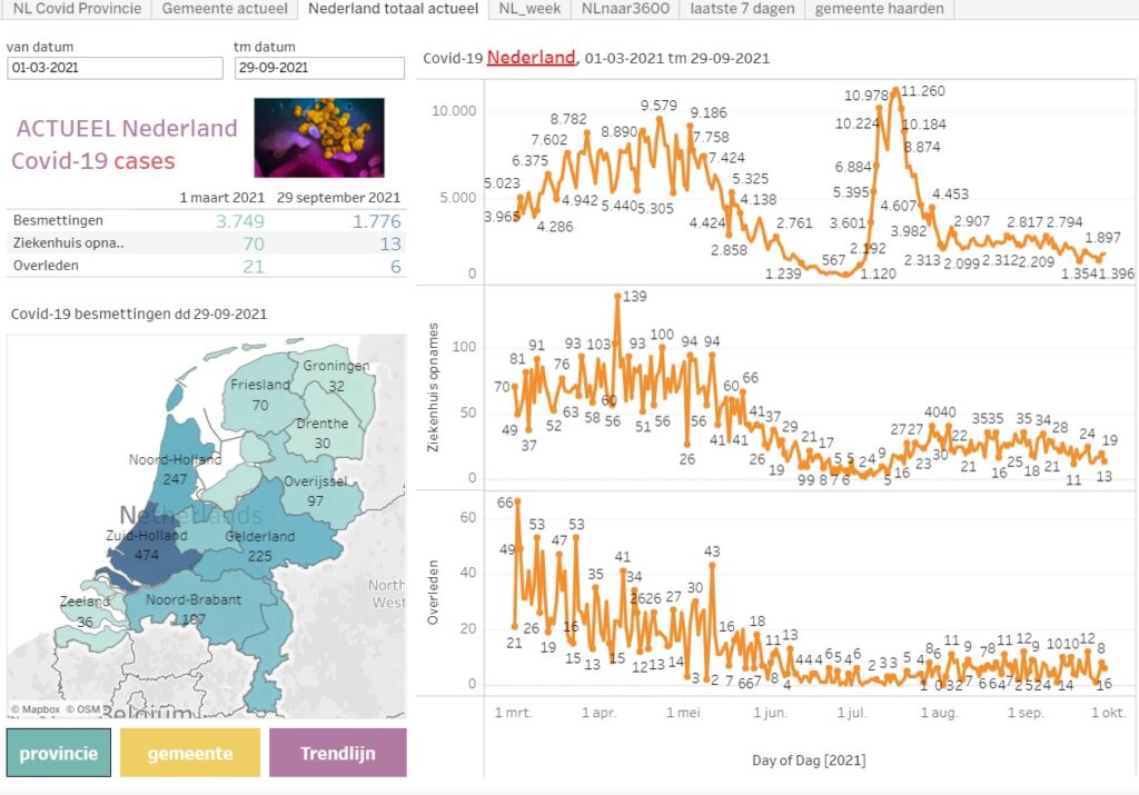 De laatste dagen zijn er minder dan 2000 nieuwe besmettingen gemeten, ondanks de stijging van testaanvragen vanwege de verplichte CoronaCheck in het uitgaansleven per 25 september.