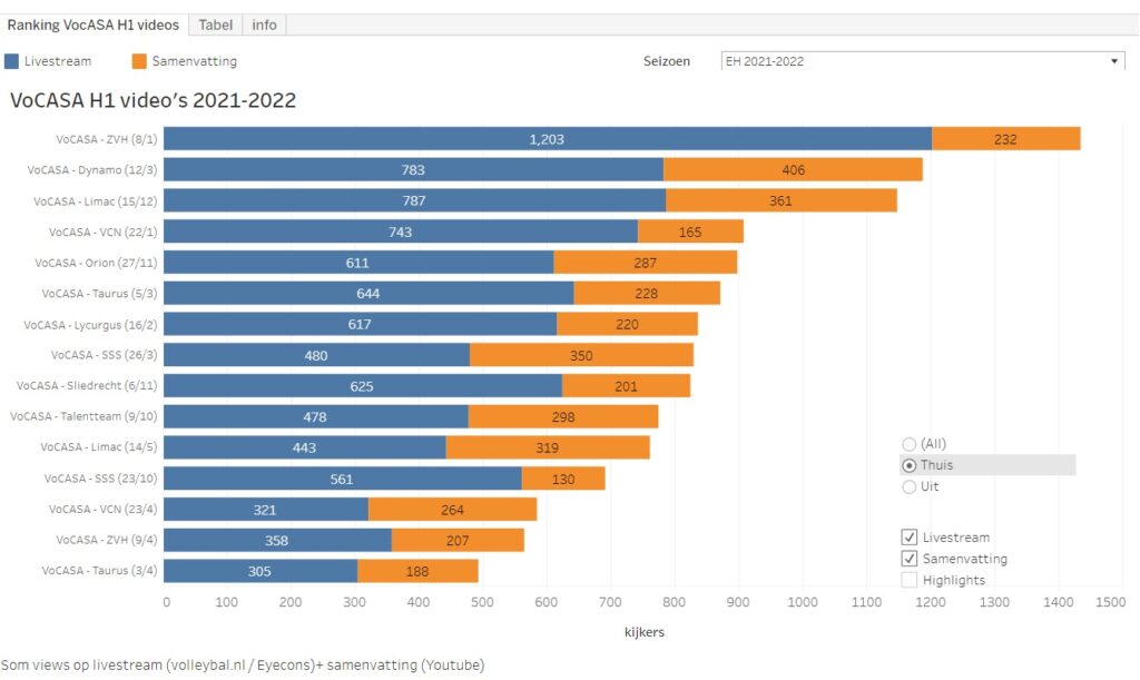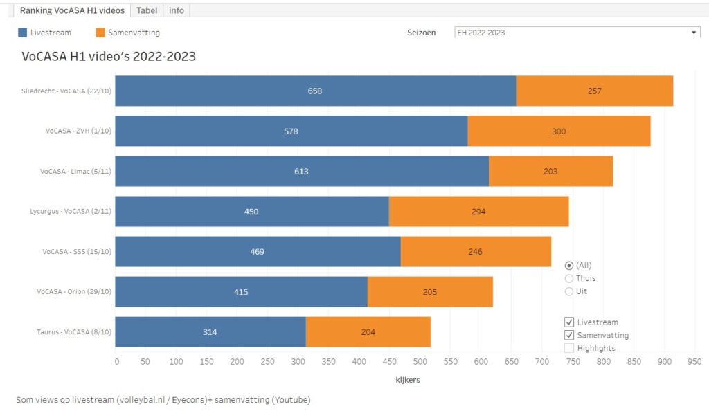 Van de wedstrijden sinds 1 okt 2022 is de uitwedstrijd bij Sliedrecht het meest bekeken (658x de livestream en 257x de samenvatting), kort gevolgd door de thuiswedstrijden tegen RECO/ZVH (578 + 300) en Numidia VC Limac (613+203)