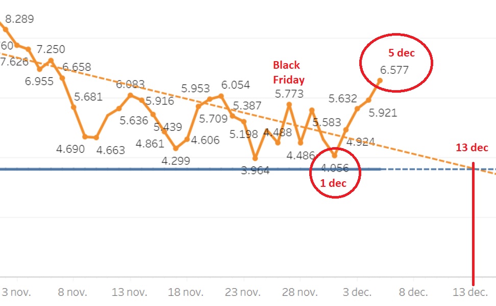 Op 1 december was er nog een mooie daling in het aantal Covod-19 besmettingen. Maar in de 4 dagen erna steeg het aantal besmettingen gestaag.
